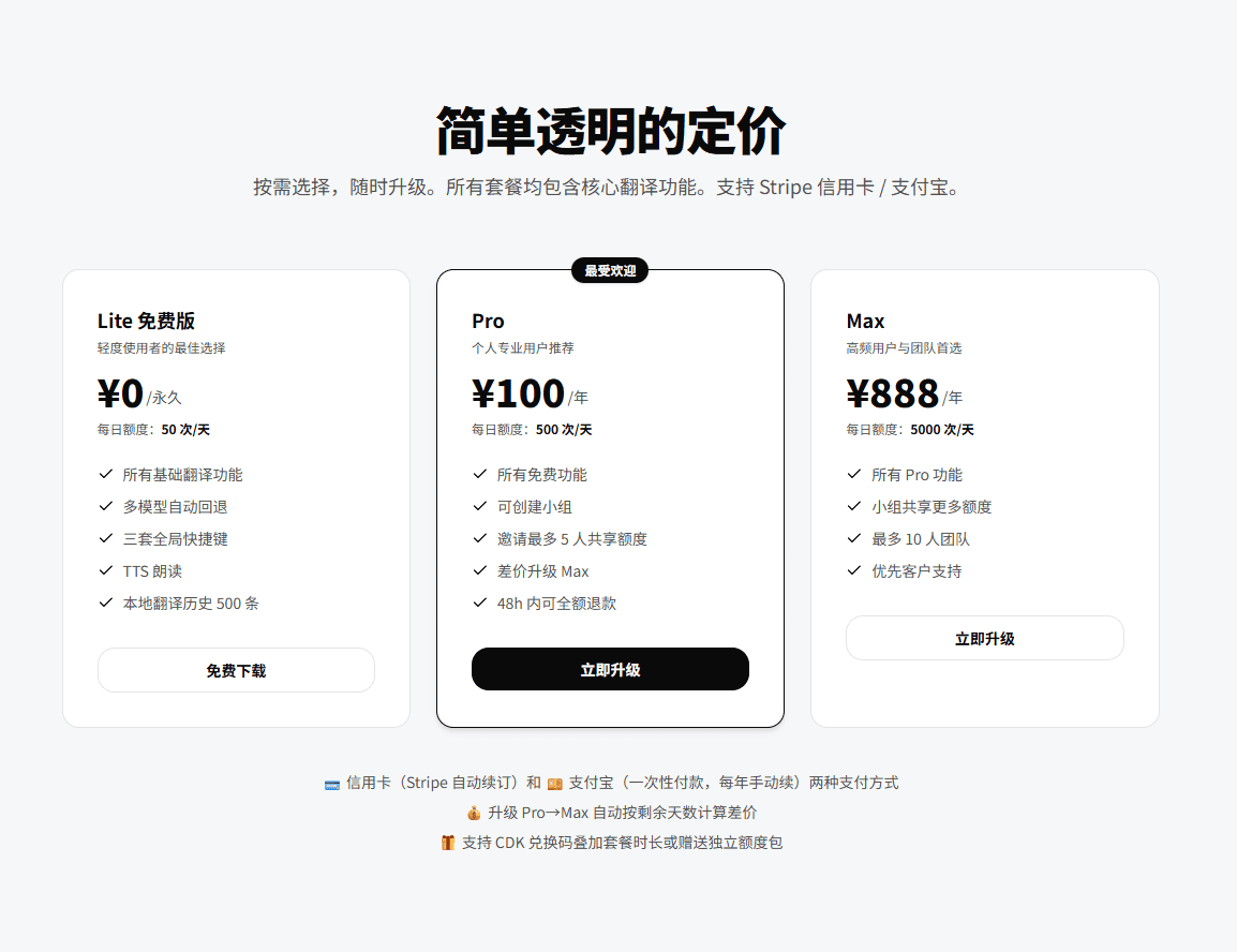 Flexible upgradesUpgrading from Pro to Max automatically calculates the price difference based on the remaining days, without needing to wait for the expiration date.